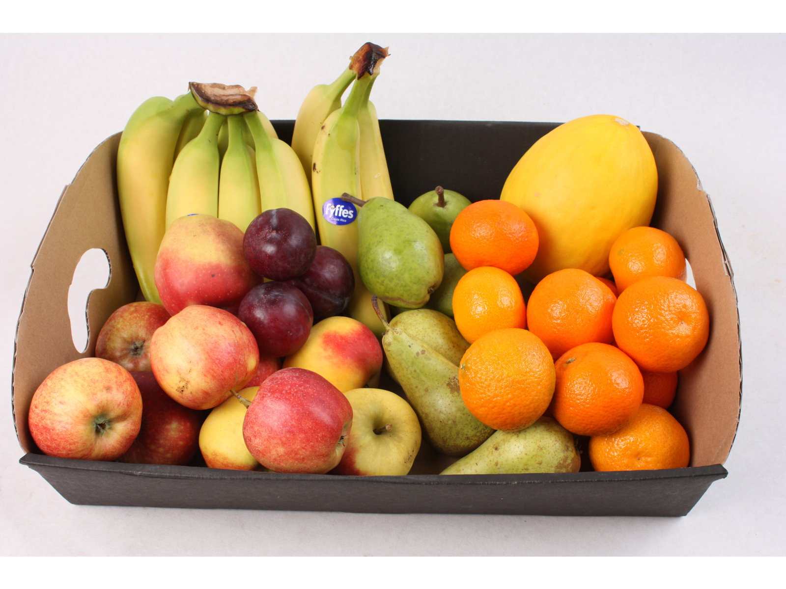 banan, æbler, pærer, årstidens frugt(clementiner, blommer, appelsiner, nektariner, ferskner, m.m.) og