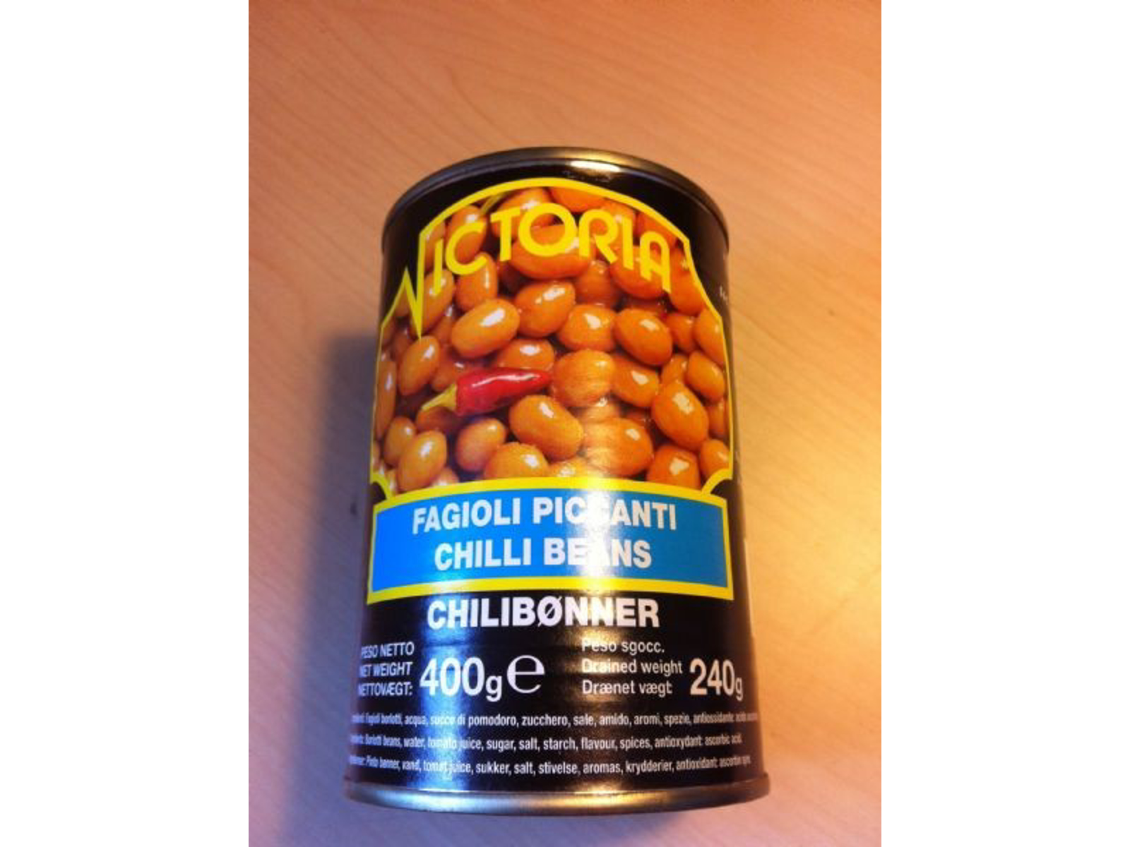 Bønner i chilisauce, i dåse, fra Victoria'Fagioli Piccanti'Ingredienser: Pinto bønner, vand, tomat juice, sukker, salt, stivelse, krydderier, antioxidant: ascorbinsyreNettoindhold: 400 g.