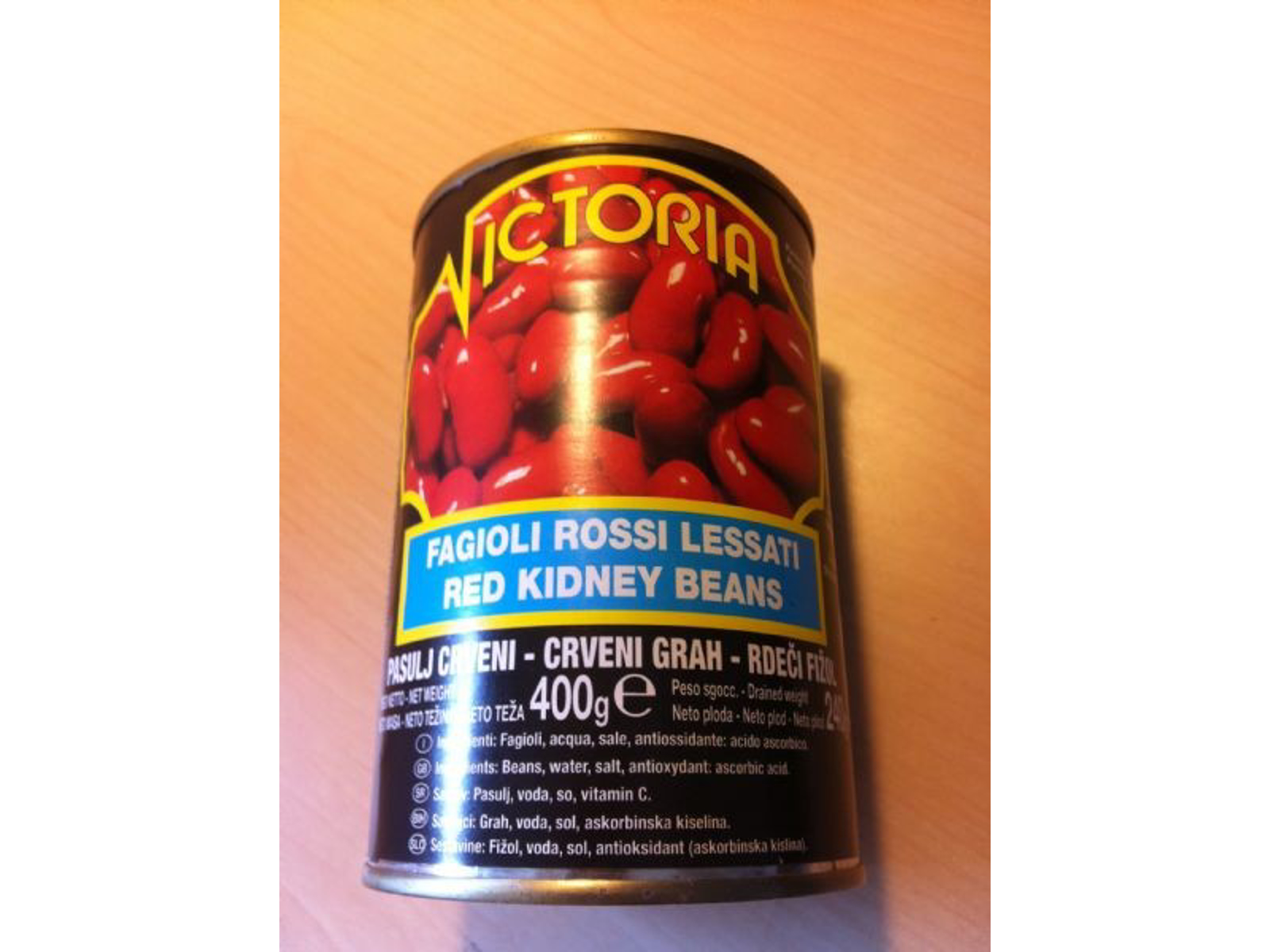 Røde kidney bønner, fra Victoria.Ingredienser: Bønner, vand, salt, antioxidant: ascorbinsyreNettoindhold: 400 g.